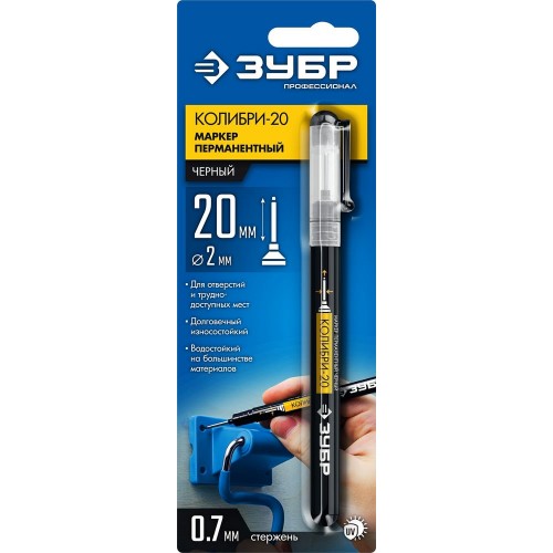 Перманентный маркер ЗУБР Колибри-20 06328-2_z01, предназначен для нанесения разметки. Перманентный, водостойкий практически на всех материалах, пишет практически на любой поверхности: пластик, дерево, металл, бетон, стекло, бумага, картон. Заостренный наконечник маркера позволяет делать тонкие надписи на мелких и узких предметах. Так как перманентный маркер пишет практически на любой поверхности, он применяется в различных сферах, где требуется нанести надпись, рисунок, знак или указатель.