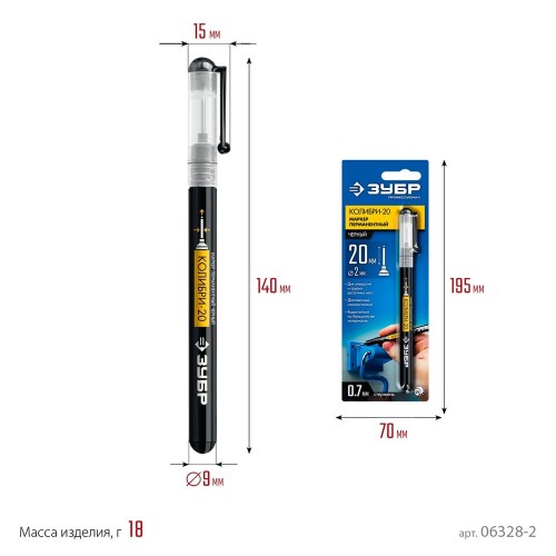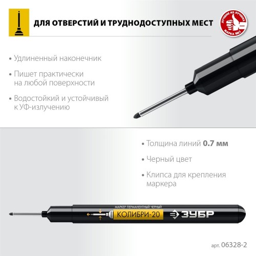 Маркер ЗУБР 06328-2, предназначен для нанесения разметки. Удлиненный наконечник маркера позволяет наносить пометки сквозь небольшие отверстия. Перманентный маркер пишет практически на любой поверхности, применяется в различных сферах, где требуется разметить отверстие или сделать пометку сквозь небольшое отверстие.
