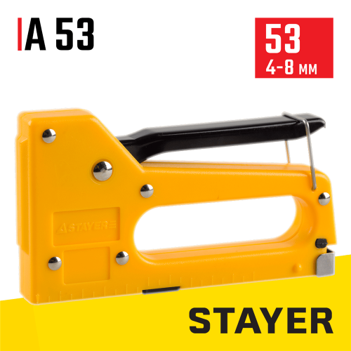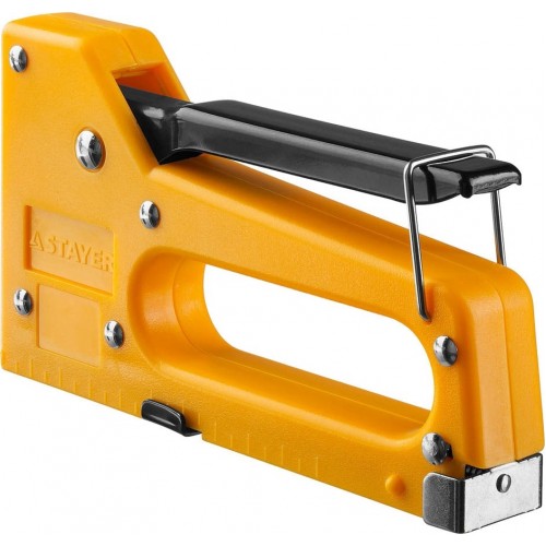 Степлер мебельный строительный STAYER 3140_z01, применяется для работы при креплении различных материалов с помощью скоб. Для узкой скобы. Прочный корпус из ABS пластика. Боек из закаленной стали.