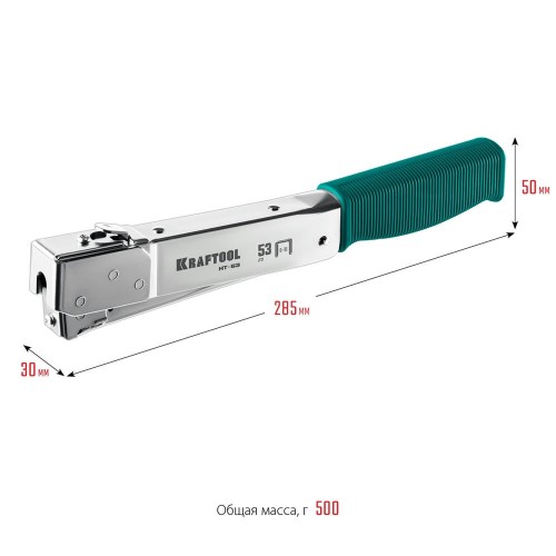 Скобозабиватель высокоскоростной стальной KRAFTOOL HT-53 3153, предназначен для крепления различных материалов с помощью скоб. Стальной хромированный корпус. Тип и размер используемых скоб: 53 (6 -10 мм).