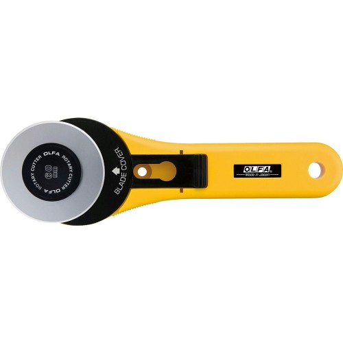 Поставляется с лезвием OLFA RB60, обеспечивающим вдвое больший объем резки по сравнению со стандартным лезвием. Большой диаметр, 60 мм, разрезает до двенадцати слоев хлопчатобумажной ткани за один проход