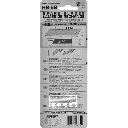 Лезвия OLFA OL-HB-5B, используются в качестве сменных рабочих элементов в ножах с шириной направляющей пластины 25 мм для разрезания различных материалов: линолеума, ковровых покрытий, гипсолитовых плит, гипсокартона, кровельных материалов, пластика, дерева.