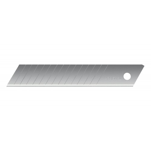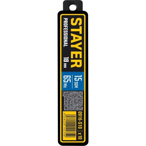 Лезвия STAYER 0916-S10, используются в качестве сменных рабочих элементов в ножах с шириной направляющей пластины 18 мм для профессионального реза различных материалов: бумаги, картона, обоев и пленки. Обладают повышенным ресурсом, обеспечивают длительную и качественную работу.
