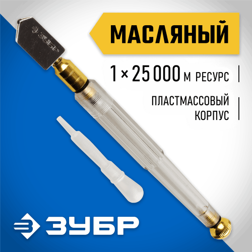 Стеклорез ЗУБР - оптимальный инструмент для точной и аккуратной резки стекла. Пластмассовая рукоятка и твердосплавный режущий элемент обеспечивают длительный срок службы инструмента. Использование масла облегчает процесс резки и увеличивает срок службы режущего элемента