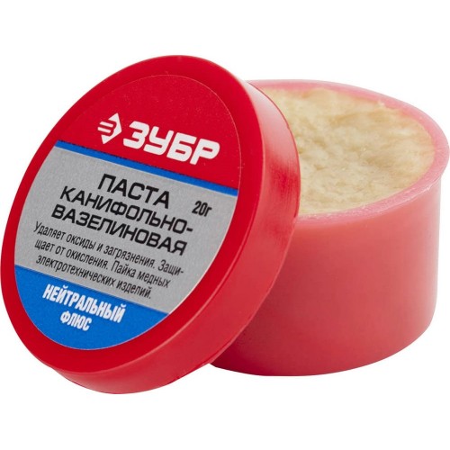 Канифольно-вазелиновая паста Зубр 55475-020, применяется для пайки элементов радиомонтажа и печатных плат легкоплавкими припоями. Хорошо держится на металлических контактах, обеспечивая точное дозирование и высокую скорость нанесения на большое количество мест паек. Защищает от окисления поверхность нагреваемого металла и расплавленный припой, улучшая качество пайки.