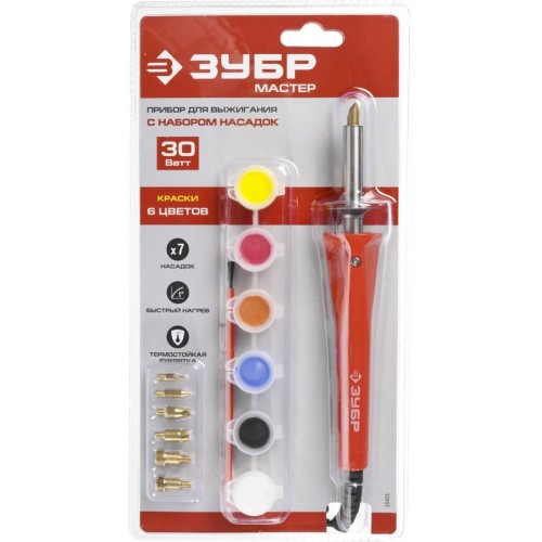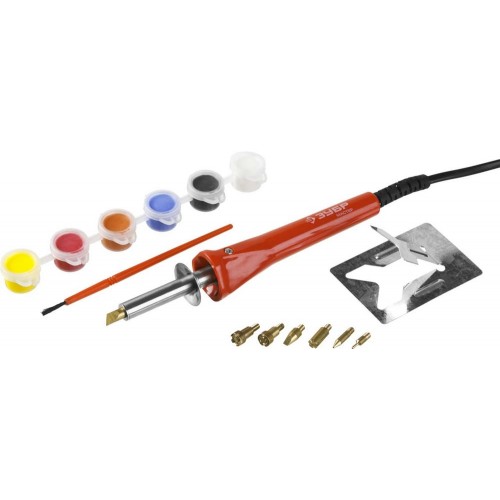 Прибор для выжигания ЗУБР 55425, используется для выполнения художественных выжиганий на деревянных поверхностях и коже. Оснащен насадками со специальным покрытием, обеспечивающим качественную работу по дереву. Легкая эргономичная рукоятка с упором для фиксации прибора на подставке. Компактный размер. 7 насадок для нанесения различных изображений на деревянную поверхность. Набор красок для творческого оформления изображения.