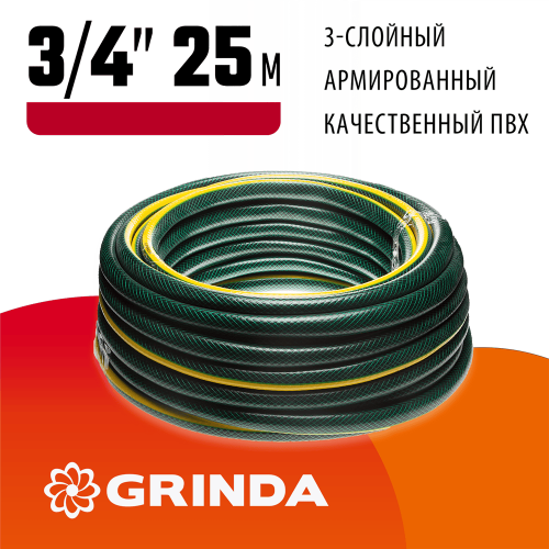 Шланг для полива армированный GRINDA 429000-3/4-25, используются на садово-огородных участках при проведении поливочных или иных работ, требующих водоснабжения. Эластичный трехслойный шланг изготовлен из высококачественного ПВХ и армирован прочными полиэстеровыми нитями. Высокая устойчивость формы шланга достигается благодаря особой технологии армирования: нити накладываются под оптимальным углом к горизонтальной оси шланга. За счет этого диаметр и длина шланга остаются стабильными.