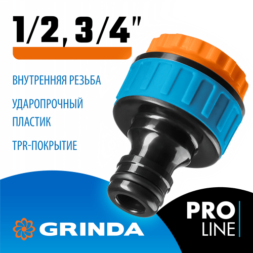 Адаптер GRINDA 8-426405_z01, применяется в качестве переходника между соединителем и водопроводной трубой или краном с внешней резьбой 1/2”, 3/4”. Ударопрочный пластик с резиновым TPR-покрытием. Стойкие к воздействиям уплотнительные кольца.