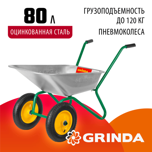 Тачка GRINDA 422400_z01, применяется для транспортирования различных грузов во время проведения садовых работ. Стальной кузов толщиной 0,7 мм и объемом 80 л для сыпучих грузов имеет цинковое покрытие, обеспечивающее защиту от внешних воздействий. Стальная рама из цельногнутой трубы диаметром 28 мм поддерживает кузов снизу и обеспечивает повышенную грузоподъемность тачки. Резиновое пневматическое колесо диаметром 360мм, со стальным ободом и на стальных подшипниках, обеспечивает легкое передвижение по неровной поверхности, отличную маневренность и устойчивость.