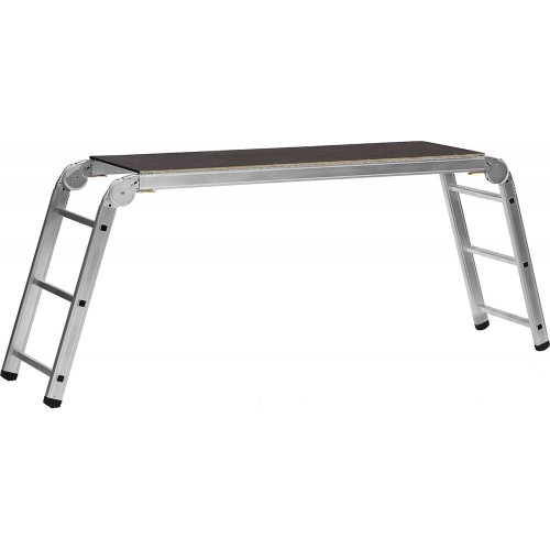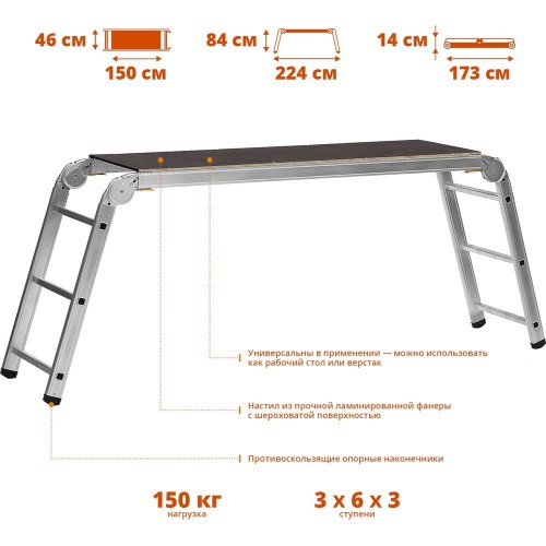 Рабочие подмости СИБИН 38843, предназначены для выполнения различных хозяйственных работ. Широкая рабочая платформа. Прочная и легкая конструкция. Замки шарнирных соединений обеспечивают надежную фиксацию. Противоскользящие опорные наконечники.