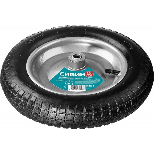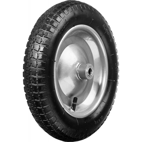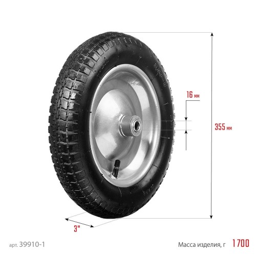 39908, а также аналогичных тачек других производителей. Стальной диск. Стальные подшипники с посадочным размером 16 мм. Перед использованием необходимо накачать колесо до давления 1,8-2 атм. Отличается прочной конструкцией и обеспечивает легкое перемещение грузов и отличную маневренность тачек.