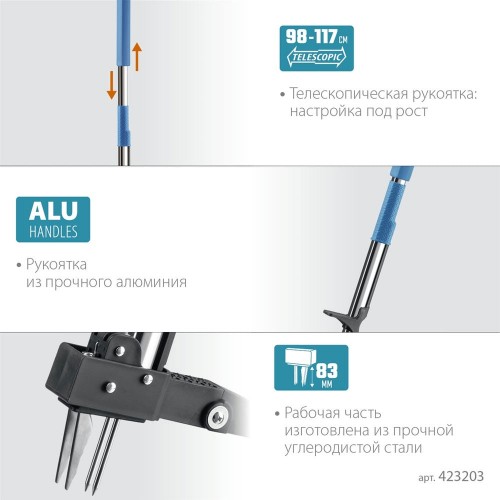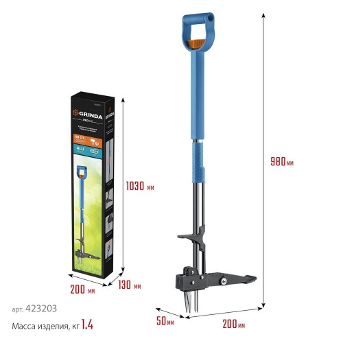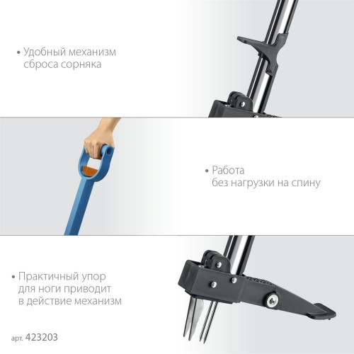 Удалитель сорняков механический GRINDA 423203 применяется для удаления любых типов сорняков. Зубья выполнены из прочной углеродистой стали. Инструмент позволяет глубоко проникать в почву и захватывать корень растения со всех сторон, удаляя его с небольшим количеством земли. Алюминиевая рукоятка оснащена эргономичной ручкой для более удобного захвата.