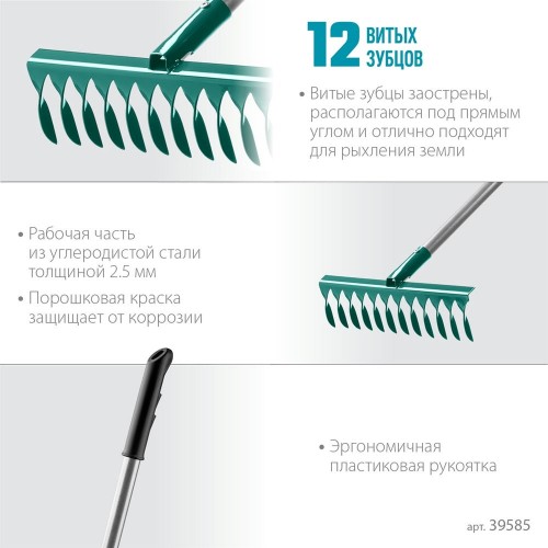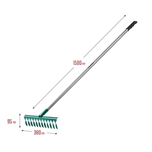 Грабли с алюминиевым черенком PROLine GRINDA 39585, предназначены для очистки газонов от скошенной травы и листьев, а также для выравнивания грядок. Рабочая часть изготовлена из высококачественной углеродистой стали и покрыта порошковой краской, защищающей инструмент от коррозии. Лёгкий и прочный алюминиевый черенок позволяет затрачивать значительно меньше усилий во время работы и увеличивает срок службы изделия. Эргономичная пластиковая рукоятка обеспечивает удобный хват и уменьшает утомляемость. Витые зубцы хорошо удерживают сухой мусор.
