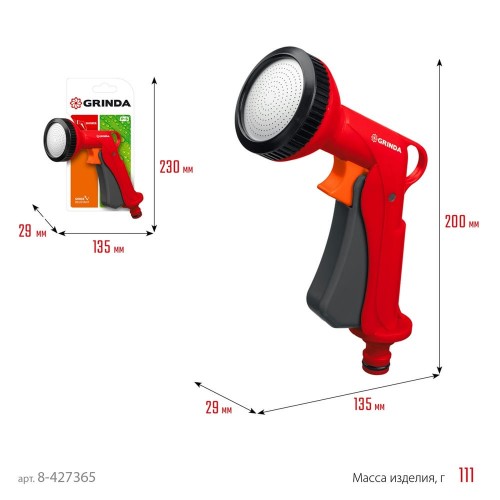 Пистолет поливочный GRINDA 8-427365_z01, предназначен для полива растений при подключении к садовому шлангу с помощью соединителя. Фиксирующий механизм удобен при продолжительном поливе. Корпус изготовлен из легкого ударопрочного ABS-пластика.