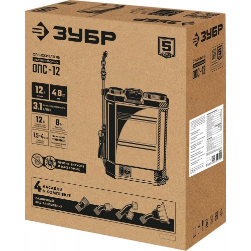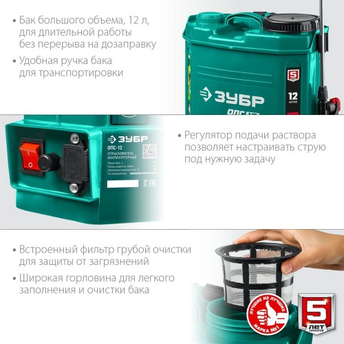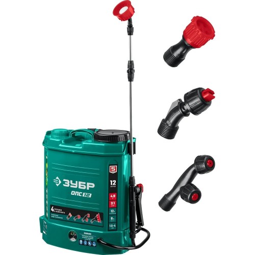 Опрыскиватель аккумуляторный ЗУБР ОПС-12, применяется для обработки и полива растений, проведения дезинфекции, уборки помещений, мойки автомобиля. Ранцевый аккумуляторный распылитель, обладающий небольшим весом, отличается эффективностью, мобильностью, экологичностью. Бережно орошает растения. Большой бак для смеси объемом 12 л обеспечивает длительную работу без дозаправки. Наличие регулятора давления позволяет настраивать струю под нужную задачу.