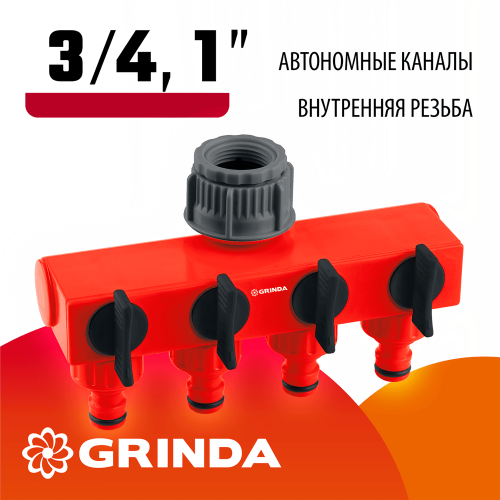 Распределитель GRINDA 8-426314_z01, предназначен для одновременного подключения четырех водозаборных линий к водопроводной трубе или крану с внешней резьбой 3/4" или 1”.