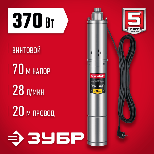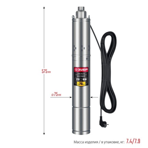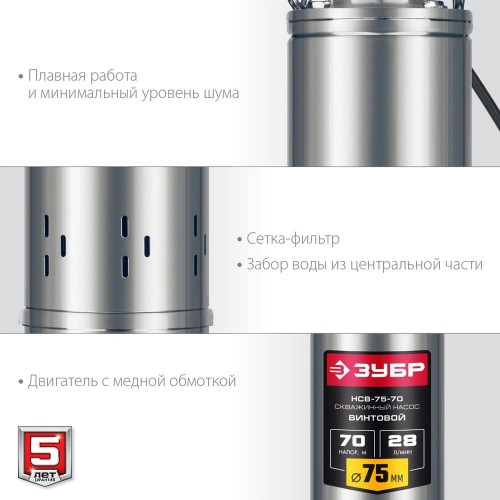 Скважинный насос ЗУБР НСВ-75-70, предназначен для подачи воды из скважин. Надежная конструкция. Проушины крепления троса. Материал обмотки двигателя - медь. Термореле для защиты от перегрева. Встроенный конденсатор. Эффективное и простое решение для организации подачи воды в дом и для организации полива в саду.