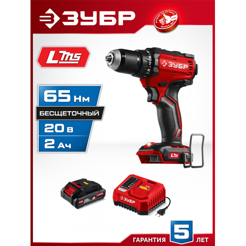 ЗУБР 20 В, 65 Н·м, 1 АКБ LMS (2 А·ч), бесщеточная дрель-шуруповерт (ДБ-65-21)
