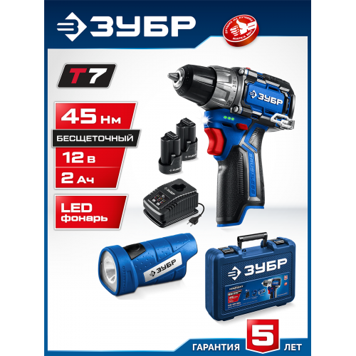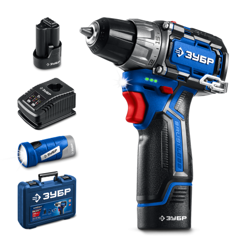 ЗУБР Набор: бесщеточная дрель-шуруповерт КОМПАКТ, LED фонарь, 2 АКБ (2 А∙ч), кейс, Профессионал (DB-121-22F)