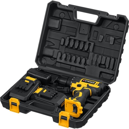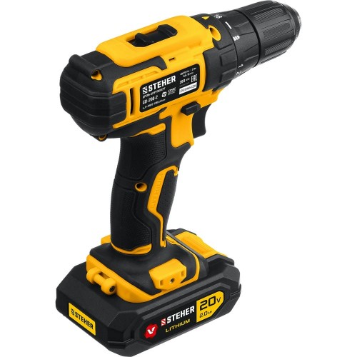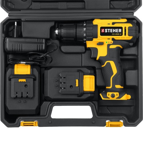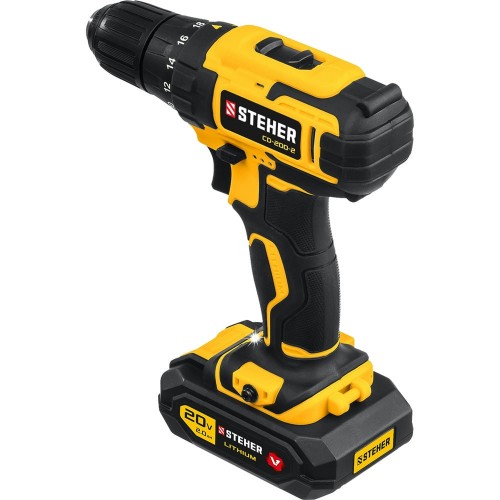 Аккумуляторная дрель шуруповерт STEHER CD-200-2, предназначена для сверления отверстий в различных материалах (при установке сверла), а также для вкручивания/выкручивания шурупов, саморезов и винтов (при установке соответствующих бит). Компактный, мощный аккумуляторный шуруповерт в линейке единой аккумуляторной платформы 20 В. Два аккумулятора универсальной системы Li-Ion V1 20 В повышенной емкости 2.0 А*ч позволяют инструменту работать дольше и эффективнее. Высокий крутящий момент при широком диапазоне оборотов благодаря конструкции редуктора. Бесключевой одномуфтовый патрон для максимальной простоты и скорости замены расходного инструмента. Двухскоростной планетарный редуктор позволяет как заворачивать с большим крутящим моментом, так и сверлить на высоких оборотах. Широкий диапазон регулировки крутящего момента превращает изделие в универсальный инструмент: от аккуратного закручивания маленьких винтиков до заворачивания крупных саморезов. Возможность быстрой смены биты благодаря блокировке шпинделя.
