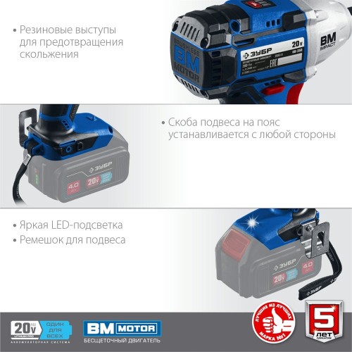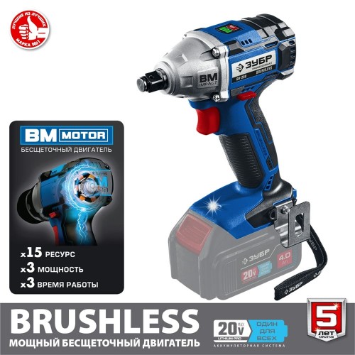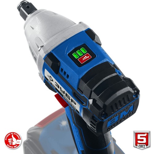 Гайковерт Зубр GB-250, предназначен для заворачивания/отворачивания крепежа (при сборке/разборке металлических конструкций, снятии/установке колес автомобиля и т.д.) Ударная функция позволяет заворачивать крепеж большого диаметра и отворачивать приржавевшие метизы. Бесщеточный двигатель Brushless обладает целым рядом преимуществ по сравнению с обычным щеточным двигателем: высокий крутящий момент в 2 раза выше, чем у аналогичного щеточного двигателя, высокий КПД благодаря максимально эффективному преобразованию электромагнитной энергии в механическую (ввиду отсутствия перекоммутаций), низкое энергопотребление, вследствие чего изделие работает до 4 раз дольше на одном заряде батареи, высокая степень защиты двигателя благодаря интеллектуальному управлению, контроллер двигателя позволяет гибко регулировать крутящий момент и поддерживать его на максимальном уровне в широком диапазоне оборотов, отсутствие постоянных перекоммутаций в коллекторе и, соответственно, отсутствие нагрева и т.д.