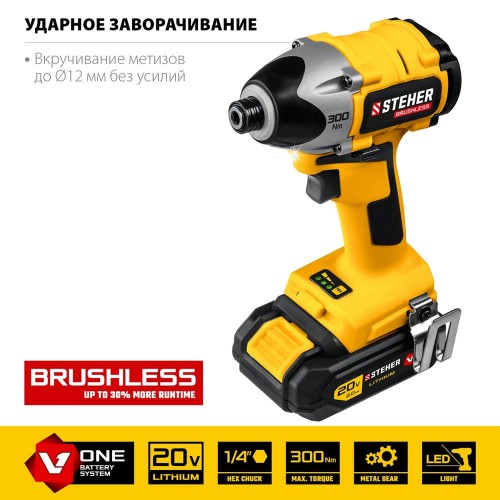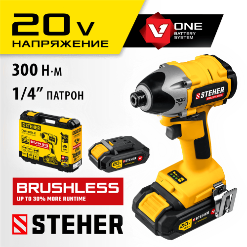 Винтоверт STEHER CSB-300-2, предназначен для заворачивания/отворачивания крепежа (при сборке/разборке металлических конструкций, снятии/установке колес автомобиля и т.д.). Незаменимый инструмент для заворачивания саморезов любого размера. Значительный крутящий момент для сложных работ. Ударная функция позволяет заворачивать крепеж большого диаметра без выворачивающей нагрузки на руку. Бесщеточный двигатель обладает целым рядом преимуществ по сравнению с обычным щеточным двигателем: высокий крутящий момент – в 2 раза выше, чем у аналогичного щеточного двигателя; высокий КПД благодаря максимально эффективному преобразованию электромагнитной энергии в механическую (ввиду отсутствия перекоммутаций). Три уровня регулировки предоставляют возможность настроить крутящий момент под предстоящую работу или используемый крепеж.