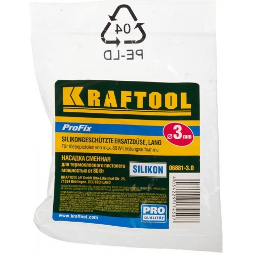 Насадка для клеевого пистолета KRAFTOOL 06881-3.0, удлиненная насадка с силиконовой защитой, предназначена для склеивания изделий из керамики, пластика, бумаги, картона, дерева и металла. Длинная насадка с отверстием срезанным под углом. Позволяет заполнять строительные швы и зазоры в труднодоступных местах, в сборе с адаптером.
