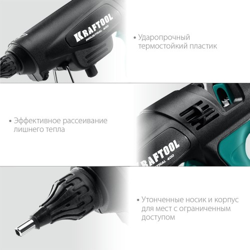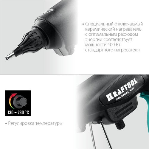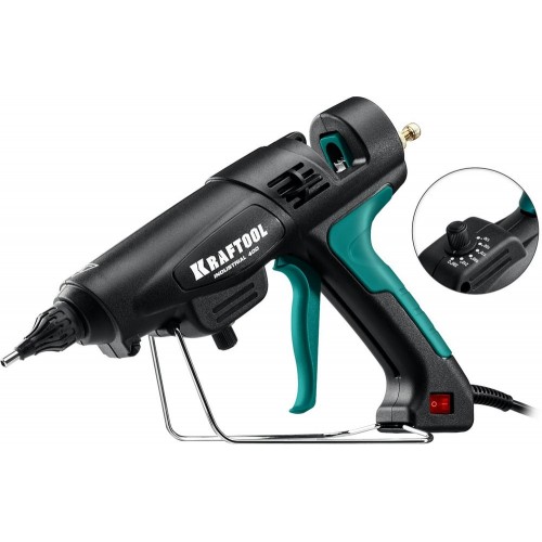 Клеевой пистолет KRAFTOOL 06843-300-12, предназначен для склеивания изделий из керамики, пластика, бумаги, картона, дерева и металла. Используются со стержнями соответствующего диаметра. Корпус пистолета изготовлен из ударопрочного термостойкого пластика. Эргономичная двухкомпонентная рукоятка обеспечивает комфортную работу при длительном использовании. Металлическое сопло защищено силиконовой накладкой. На рукоятке пистолета имеется выключатель для переведения инструмента из рабочего положения в режим ожидания. На корпусе пистолета предусмотрен регулировочный винт механической подачи клеевого состава. Оснащен встроенной подставкой.