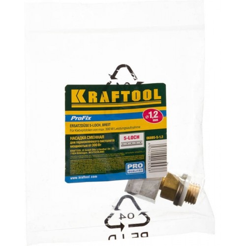 Насадка для клеевого пистолета KRAFTOOL 06885-5-1.2, предназначена для термоклеевых пистолетов мощностью от 300 Вт. Широкая насадка для коробок, 5 отверстий 1,2 мм, в сборе с адаптером. Применяется как дополнительный элемент в клеевом пистолете.