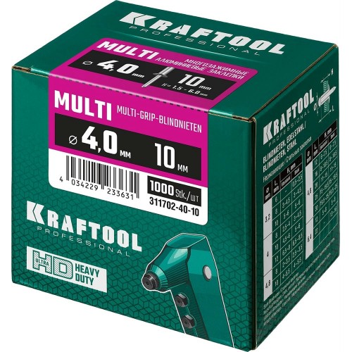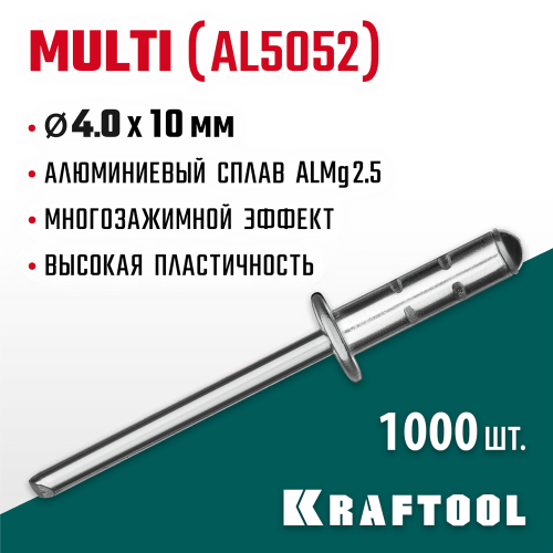 Многозажимные алюминиевые заклепки KRAFTOOL 311702-40-10, предназначены для получения неразъемного соединения из двух или более слоев материалов с помощью заклепочника.