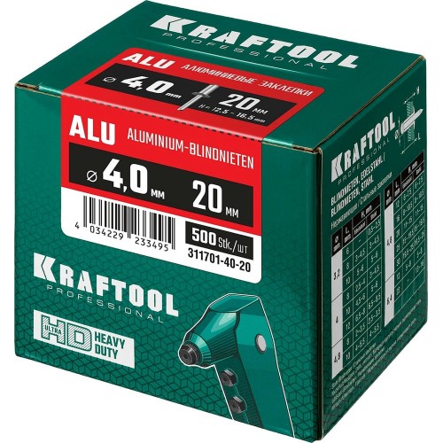 Алюминиевые заклепки KRAFTOOL 311701-40-20, предназначены для получения неразъемного соединения из двух или более слоев материалов с помощью заклепочника.