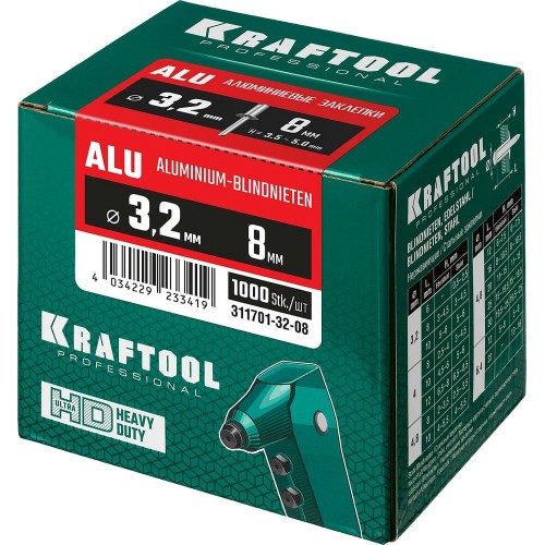 Алюминиевые заклепки KRAFTOOL 311701-32-08, предназначены для получения неразъемного соединения из двух или более слоев материалов с помощью заклепочника.