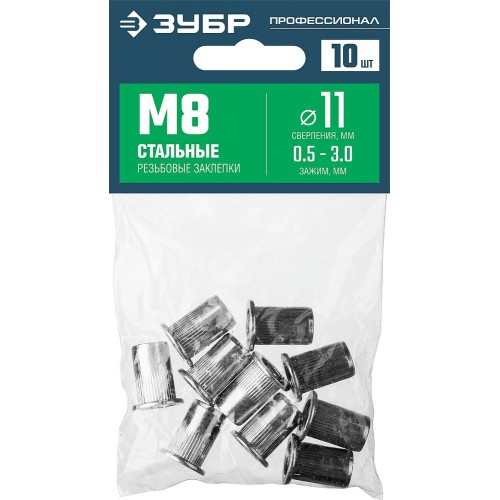 Резьбовые заклепки с насечками ЗУБР 31318-08, предназначены для получения неразъемного заклепочного и, одновременно, разъемного резьбового соединения повышенной прочности из двух и более слоев материала. Наличие насечек на корпусе защищает установленную заклепку от проворачивания в материале. После монтажа заклепки создается разъемное резьбовое соединение. Цинковое покрытие надежно защищает от коррозии.