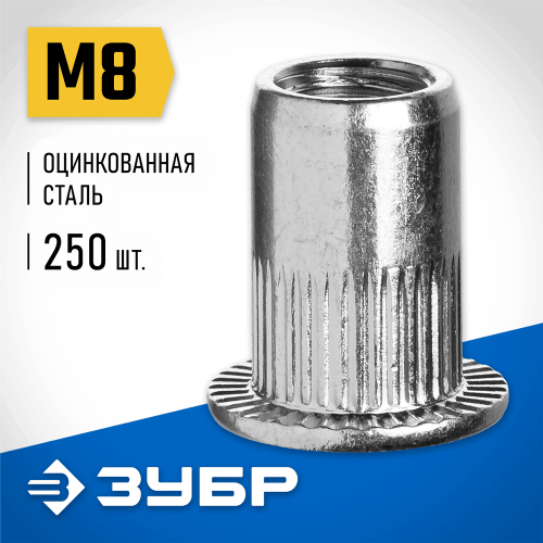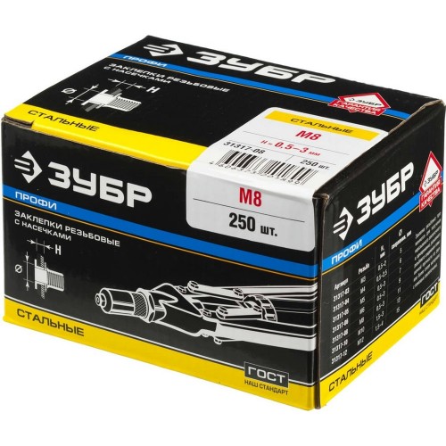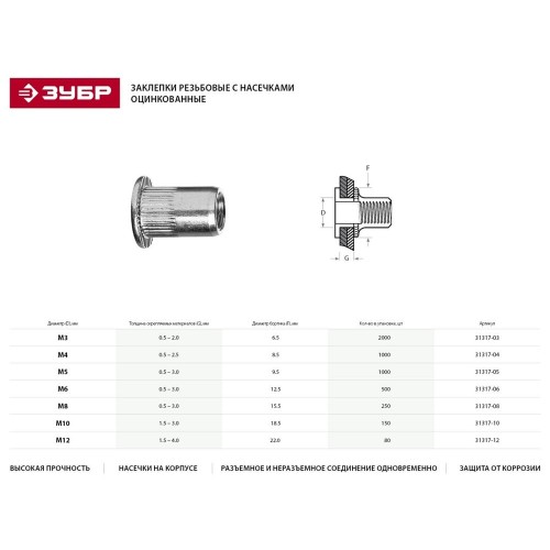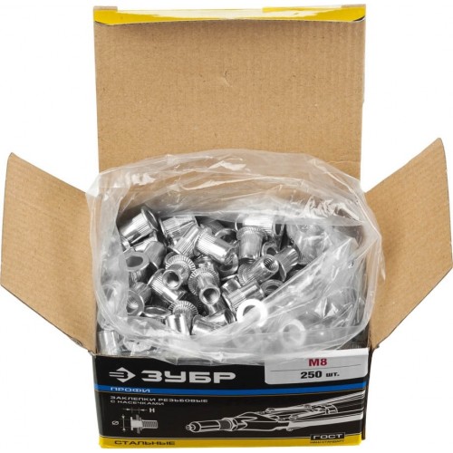 Заклепки резьбовые ЗУБР 31317-08, применяются для получения неразъемного заклепочного и, одновременно, разъемного резьбового соединения повышенной прочности из двух и более слоев материала. Установка заклепок производится в предварительно просверленное отверстие при помощи заклепочника. Широкий ассортимент заклепок позволяет скрепить разнообразные материалы при помощи заклепочника, создав надежное и прочное неразъемное соединение. Использование заклепок при монтаже различных конструкций дает возможность профессионалам существенно сократить время работы. Наличие насечек на корпусе защищает установленную заклепку от проворачивания в материале. После монтажа заклепкт создается разъемное резьбовое соединение. Изготовлены из высококачественной оцинкованной стали, что обеспечивает защиту от коррозии