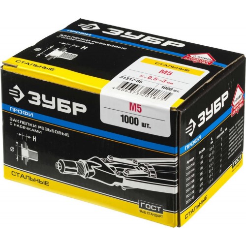 Заклепки резьбовые ЗУБР 31317-05, применяются для получения неразъемного заклепочного и, одновременно, разъемного резьбового соединения повышенной прочности из двух и более слоев материала. Установка заклепок производится в предварительно просверленное отверстие при помощи заклепочника. Широкий ассортимент заклепок позволяет скрепить разнообразные материалы при помощи заклепочника, создав надежное и прочное неразъемное соединение. Использование заклепок при монтаже различных конструкций дает возможность профессионалам существенно сократить время работы. Наличие насечек на корпусе защищает установленную заклепку от проворачивания в материале. После монтажа заклепкт создается разъемное резьбовое соединение. Изготовлены из высококачественной оцинкованной стали, что обеспечивает защиту от коррозии