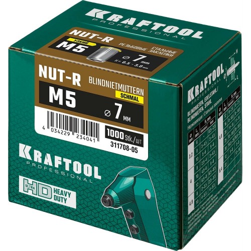 Резьбовые заклепки KRAFTOOL 311708-05, применяются для получения неразъемного заклепочного и, одновременно, разъемного резьбового соединения повышенной прочности из двух и более слоев материала. Насечки на корпусе препятствуют проворачиванию установленной заклепки в отверстии. Установленная заклепка незначительно выступает над поверхностью материала благодаря уменьшенному бортику. Создание разъемного резьбового соединения в листовых материалах. Увеличенная прочность соединения по сравнению с обычной вытяжной заклепкой. Цинковое покрытие защищает от коррозии.