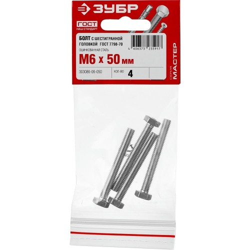 ЗУБР M6 x 50 мм, 4 шт., болт с шестигранной головкой ГОСТ 7798-70 303086-06-050 Мастер