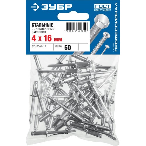 Заклепки стальные ЗУБР 313126-40-16, предназначены для получения неразъемного соединения из двух или более слоев материалов с помощью заклепочника. Корпус заклепки изготовлен из оцинкованной стали, выдерживающей большие нагрузки. Конструкция бортика обеспечивает герметичность соединения.