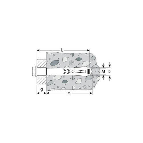 - Фиксация анкера в основании достигается путем вкручивания болта. При этом происходит расклинивание, и анкер удерживается в основании за счет сил трения.
