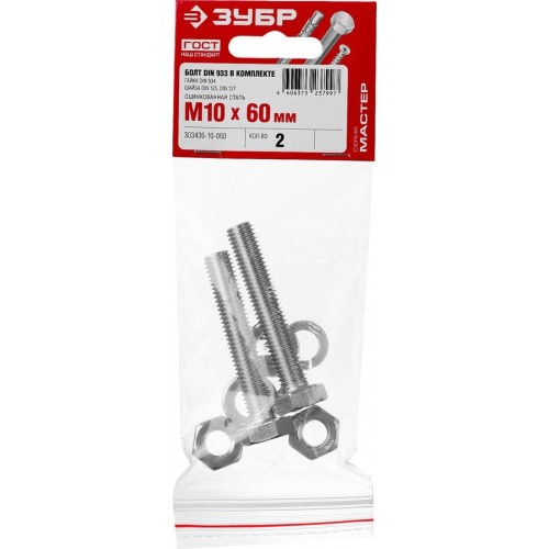 ЗУБР M10 x 60 мм, 2 шт., болт с шестигранной головкой в комплекте с гайкой, шайбой, шайбой пружинной 303436-10-060
