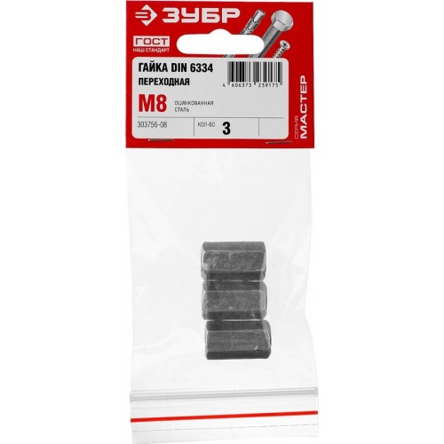 Гайка DIN 6334 переходная ЗУБР Мастер 303756-08, применяется для крепления различных деталей и конструкций в машиностроении и строительстве. Благодаря удлиненной форме гайка переходная используется для наращивания длины шпилек, болтов или винтов. Цинковое покрытие защищает от коррозии и продлевает срок службы изделия. Гайка переходная изготовлена из высококачественной стали в полном соответствии с действующими стандартами и техническими предписаниями.