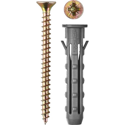 Для монтажа элементов и конструкций к полнотелым строительным материалам (бетон, кирпич, природный камень). Фиксация дюбеля в основании происходит при вкручивании в него самореза (входит в комплект поставки). Диаметр предварительного сверления: 6 мм.