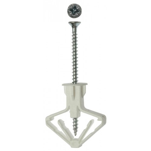 Дюбель для пустотелых конструкций "БАБОЧКА" ЗУБР 4-301326, применяется для крепления к тонкостенным материалам (фанера, ДСП, гипсокартон и т.п.) легковесных элементов, таких, как светильники, люстры, плинтусы, выключатели, рейки и проч. при помощи шурупов или саморезов. При установке дюбель раскрывается в виде зонта с обратной стороны листового материала, создавая надежное соединение. Специально разработанная форма дюбеля предотвращает проворачивание в отверстии.
