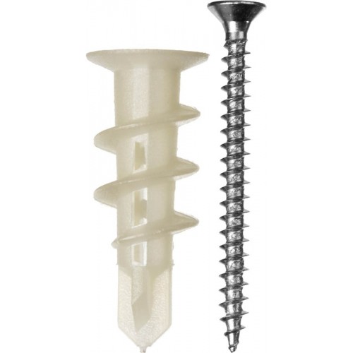 - Высокая резьба с крупным шагом увеличивает площадь контакта и фиксирует дюбель в гипсокартоне, не разрушая его.