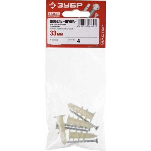 Дюбели "ДРИВА" ЗУБР 4-301266, применяются для крепления к гипсокартону светильников, люстр, плинтусов, реек и др. при помощи саморезов (входят в комплект поставки). Дюбели гипсокартона изготовлены из высококачественных материалов и используются для крепления различных элементов и конструкций к несущему основанию. Находят широкое применение в быту для крепления различных легковесных элементов и конструкций. Наличие сверла позволяет производить монтаж без предварительного сверления. Высокая резьба с крупным шагом увеличивает площадь контакта и фиксирует дюбель в гипсокартоне, не разрушая его. Широкий диапазон рабочих температур благодаря высокой пластичности нейлона: от -40С до +80С. Нейлон устойчив к воздействию влаги, что позволяет использовать дюбели при выполнении наружных работ. Саморезы в комплекте.