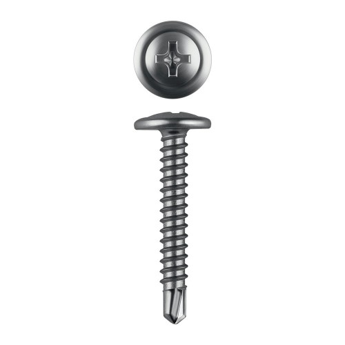 Саморезы с пресс-шайбой и сверлом для листового металла изготовлены из стального прутка с высоким содержанием углерода. Контроль за геометрией самореза начинается с калибровки прутка и заканчивается тщательной проверкой размеров готового изделия. Нормативная твердость стали достигается термической обработкой. Поверхностная твердость 560-720HV, твердость в сердцевине 240-425HV. Саморезы легко вкручиваются обычным шуруповертом или отверткой с крестообразным шлицем PH2 (DIN). Предварительное сверление в скрепляемых материалах не требуется. Геометрические размеры: диаметр пресс-шайбы (W) - 10.5-11.0мм, диаметр головки (Dk) - 6.5-7.0мм, диаметр резьбы (D) - 4.04-4.22мм, диаметр сверла (dp) - 3.1-3.2мм, длина сверла (ds) - 3.7-3.8мм, шаг резьбы (Pi) - 1.41мм.
