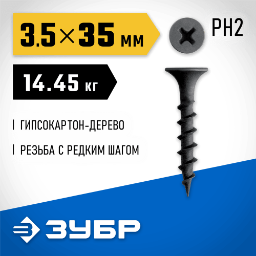 Саморезы гипсокартон-дерево ЗУБР 300030-35, предназначены для крепления гипсокартона к деревянной обрешетке, не допуская крошение волокнистой структуры дерева.