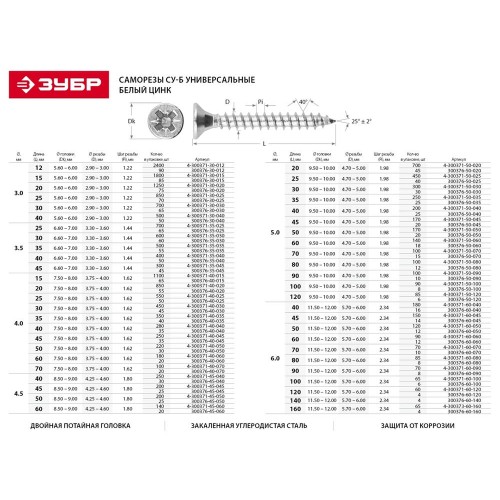 Саморезы по дереву ЗУБР 4-300371-40-025, предназначены для крепления различных материалов к деревянному основанию. Саморезы по дереву изготовлены из высококачественной стали, прошедшей термическую обработку. В отличие от шурупов, саморезы не требуют предварительного сверления в скрепляемых материалах. Находят широкое применение при выполнении бытового ремонта, сборке и установке различных конструкций. Двойная потайная головка утапливается в древесине, что придает конструкции более эстетический вид. Цинковое покрытие обеспечивает надежную защиту от коррозии.