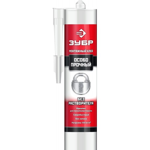 Монтажный клей особопрочный, без растворителей, белый, ЗУБР 41338, предназначен для строительства и профессионального использования. Образует особопрочное влагостойкое соединение. Остается гибким и прочным на протяжении долгого времени. Экологичный (не содержит растворителей). Применяется для монтажа широкого спектра отделочных материалов: метала, дерева, камня, мрамора, кирпича, пластика, МДФ, ДСП на аналогичные поверхности, а также на бетон, штукатурку, любые типы панелей.