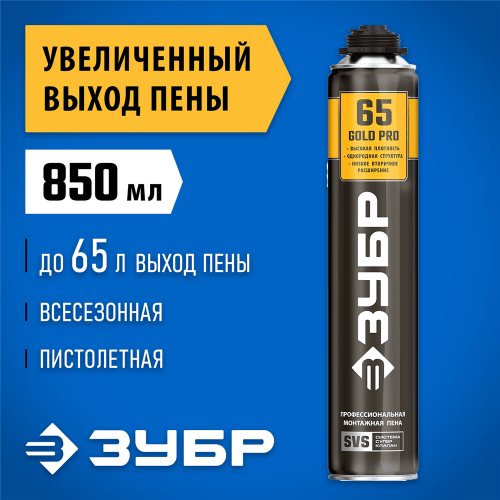 Пена монтажная ЗУБР 41157, применяется для монтажа и герметизации оконных и дверных блоков, подоконников, других строительных конструкций, для монтажа и изоляции проводки и технических коммуникаций (без контакта пены с питьевой водой); для тепло и звукоизоляции помещений; для заполнения швов, щелей и пустот. высококачественная полиуретановая всесезонная монтажная пена "GOLD PRO 65" произведена на современном оборудовании. Благодаря новой, улучшенной формуле отличается превосходным качеством и обладает характеристиками, позволяющими использовать её для широкого круга задач. Всесезонная формула позволяет применять пену в любое время года. Используется с пистолетом.